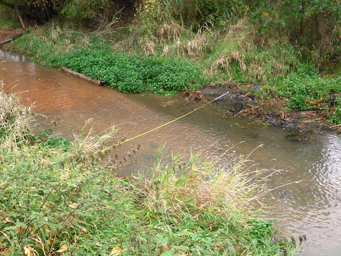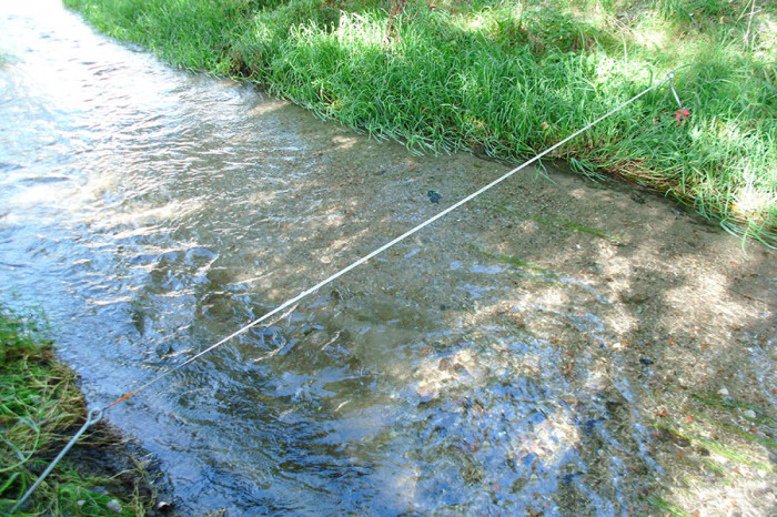 Die Bestimmung von Durchflussmengen in Fließgewässern erfolgt mit Hilfe von magnetisch- induktiven Strömungssensoren mit einem breiten Messintervall zwischen 0,0-2,5 m/s. Bei jeder Messung wird der Messquerschnitt des Gewässers mittels Bandmaß, Peilstange und Zollstock ausgemessen, in Abhängigkeit von der Gewässerbreite werden Lamellen festgelegt. Für jede Lamelle erfolgt eine Fließgeschwindigkeitsmessung in verschiedenen Tiefen, abhängig von der jeweils maximalen Wassertiefe im Messquerschnitt. Es erfolgten Messungen bspw. in Zu- und Abflüssen von Tagebauseen zur Berechnung entsprechender Frachten, die Erfassung von Fließgeschwindigkeiten kleinerer Vorfluter, u.a. in Vorbereitung von Gewässersanierungsmaßnahmen.
